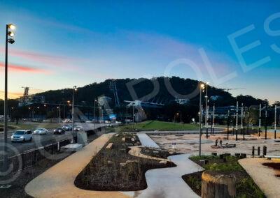 GM Poles were very happy to supply 15x 9m tapered round poles with cable exits and bracketry to suit a custom lighting layout. The poles are hot dipped galvanised and painted with a marine grade wet-spray paint rather than powdercoated due to the proximity to water.